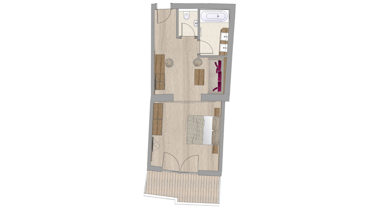 ca. 40 - 45 m², alpine 2-Raum-Suite in geräuchertem Eichenholz, Wohn- und Schlafzimmer durch eine Schiebetüre getrennt, Parkettboden, Badezimmer mit Badewanne (teilweise separate Dusche), Südbalkon mit Blick zum Hartkaiser und KaisergartenGrundriss ansehen
